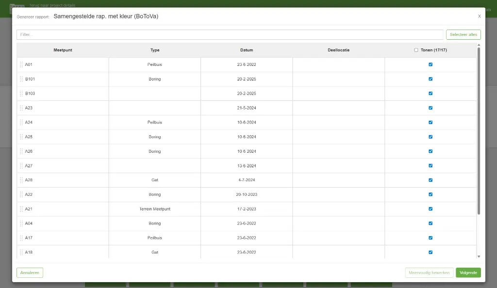 Met het ‘Dagtotalen’-overzicht kun je in één oogopslag zien wat er nog moet gebeuren en of er nog gegevens missen. Hiermee voorkom je dat je terug moet naar een locatie omdat er boringen of monsters vergeten zijn.