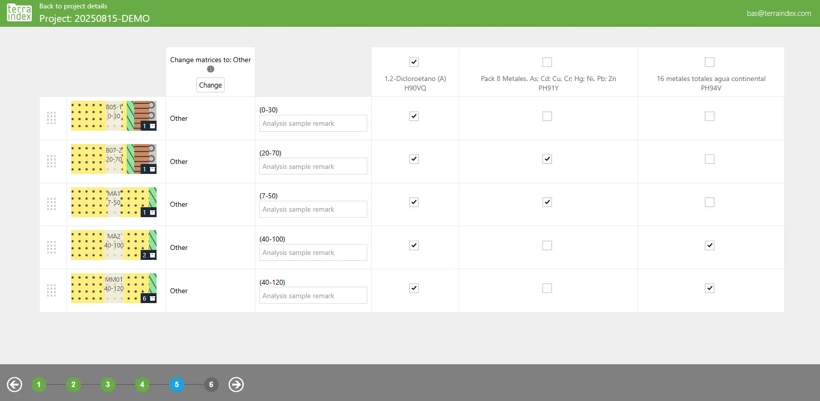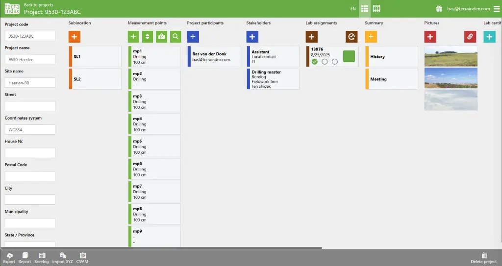 Met TerraIndex voer je veldgegevens direct digitaal in, draai je direct boorprofielen uit en stel je eenvoudig een labopdracht op. Ontvang de analyseresultaten digitaal terug en toets ze direct aan lokale wet- en regelgeving. Daarna genereer je moeiteloos een complete en professionele rapportage.