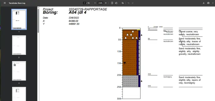 Met één druk op de knop draai je de boorprofielen uit van je project. Doordat alle gegevens digitaal ingevoerd worden, kunnen boorprofielen direct en eenvoudig uitgedraaid worden. Er zijn verschillende templates beschikbaar, die ook nog eens naar eigen wens aan te passen zijn. Hiermee kun je ook je eigen 'standaard’ templates maken. De boorprofielen kunnen zowel vanaf het veld, als vanaf kantoor uitgedraaid worden.