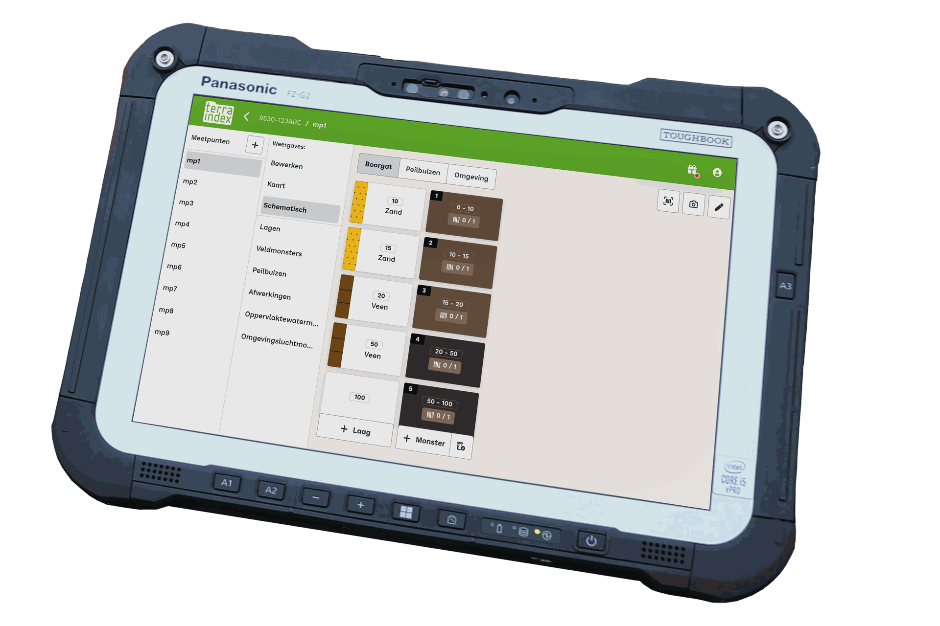 In het veld kun je makkelijk met TerraIndex aan de slag via een tablet. Onze veldwerkapp is gespecialiseerd op bodemonderzoek en ontwikkeld in samenspraak met veldwerkers. Hierdoor is het supermakkelijk in gebruik en sluit het helemaal aan bij jullie wensen.